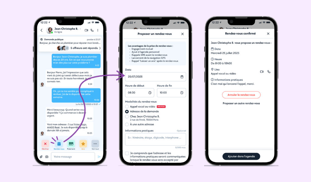 La prise de rendez-vous sur AlloVoisins est un outil intégré à vos échanges avec les clients. Elle vous permet de planifier vos interventions et d’améliorer la gestion de votre activité.